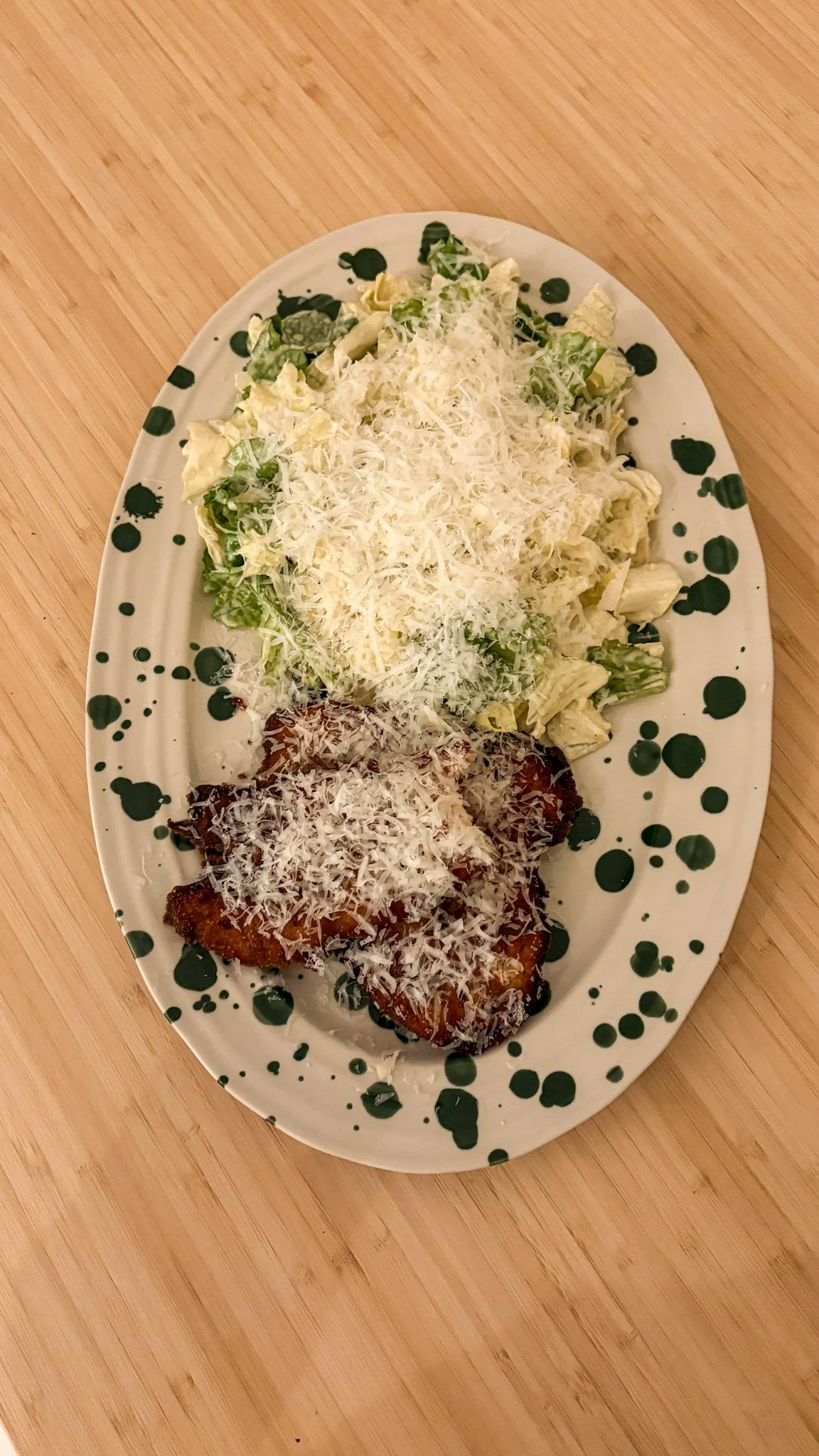tabağa önce şnitzeli üzerine hızlı sezar soslu salatayı paylaştırın.